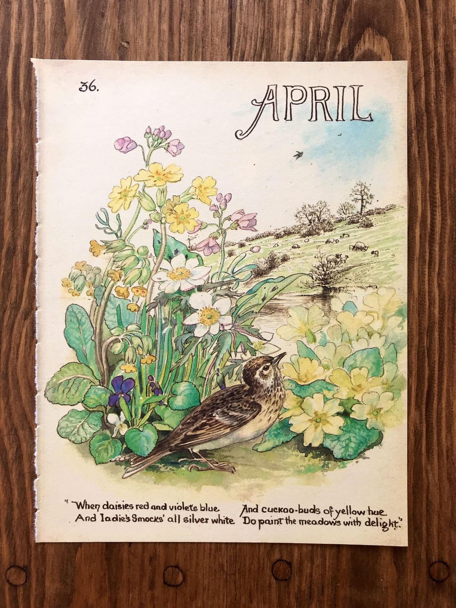This page measures 9" x 7" and features Birds, Flowers & grassland and on the reverse four verses including one penned by the artist herself.