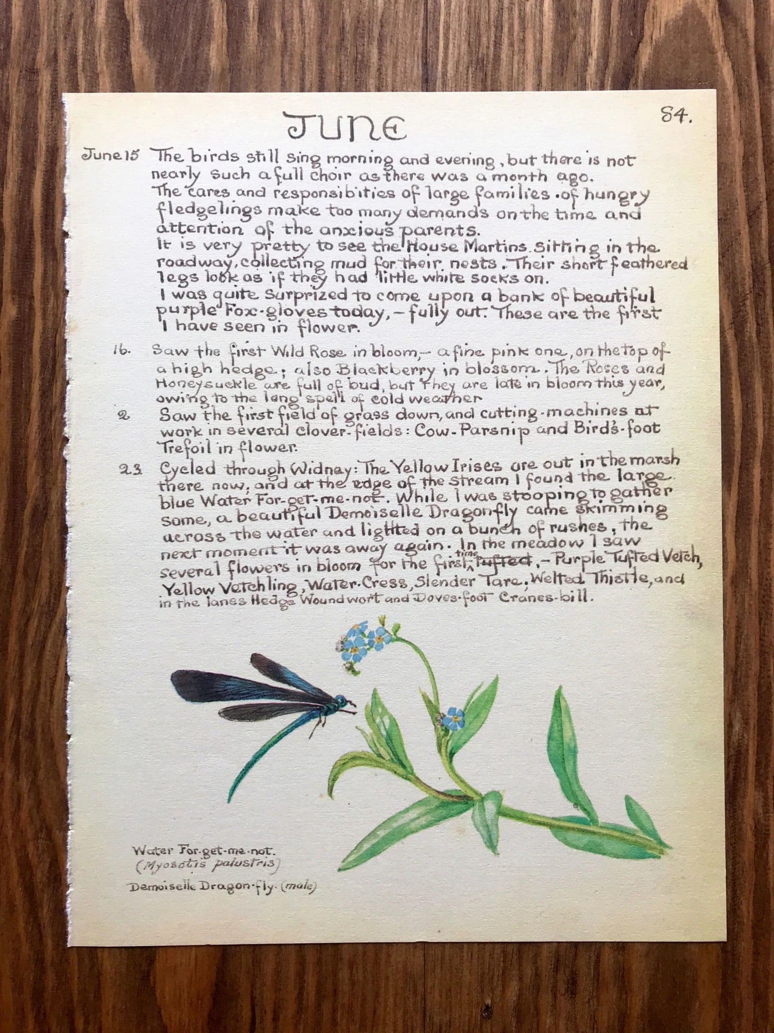 This page measures 9" x 7" and features botanical sketches of Foxglove & Trailing Rose and on the reverse diary entries, dragonfly & forget me nots.